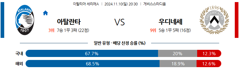[킹콩티비]11월 10일 아탈란타 BC vs 우디네세 칼초 세리에 A 해외축구분석 무료중계 스포츠분석