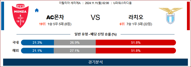[킹콩티비]11월 11일 AC몬차 vs 라치오 세리에A 해외축구분석 무료중계 스포츠분석