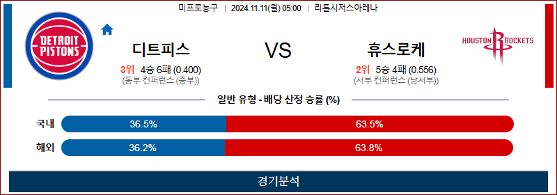 [킹콩티비]11월 11일 디트로이트 vs 휴스턴 NBA 해외축구분석 무료중계 스포츠분석