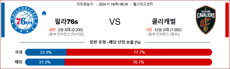 [킹콩티비]11월 14일 필라델피아 세븐티식서스 vs 클리블랜드 캐벌리어스 NBA 해외축구분석 무료중계 스포츠분석