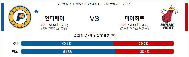 [킹콩티비]11월 16일 인디애나 페이서스 vs 마이애미 히트 NBA 해외축구분석 무료중계 스포츠분석