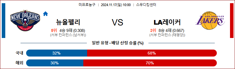 [킹콩티비]11월 17일 뉴올리언스 펠리컨스 vs LA레이커스 NBA 해외축구분석 무료중계 스포츠분석