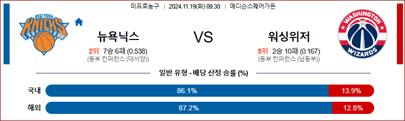 [킹콩티비]11월 19일 뉴욕닉스 vs 워싱턴 위저즈 NBA 해외축구분석 무료중계 스포츠분석