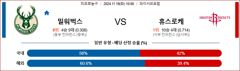 [킹콩티비]11월 19일 밀워키 벅스 vs 휴스턴 로켓츠 NBA 해외축구분석 무료중계 스포츠분석