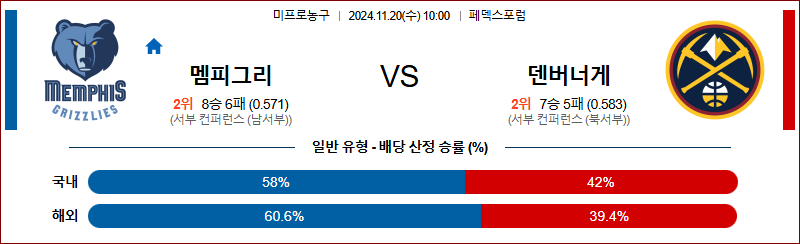 [킹콩티비]11월 20일 멤피스 그리즐리스 vs 덴버 너게츠 NBA 해외축구분석 무료중계 스포츠분석
