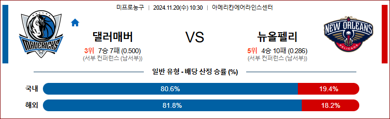 [킹콩티비]11월 20일 댈러스 매버릭스 vs 뉴올리언스 펠리컨스 NBA 해외축구분석 무료중계 스포츠분석
