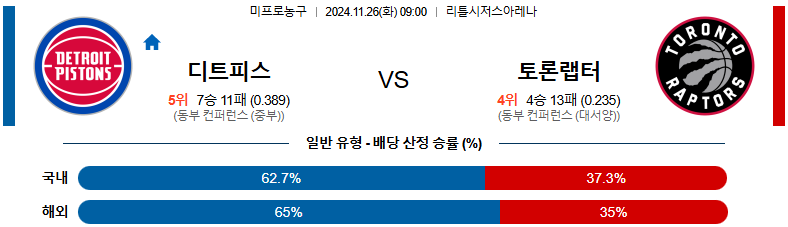 [킹콩티비]11월 26일 디트로이트 피스톤스 vs 토론토 랩터스 NBA 해외축구분석 무료중계 스포츠분석