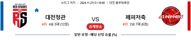 [킹콩티비]11월 27일 정관장 vs 페퍼저축은행 V-리그 (여) 해외축구분석 무료중계 스포츠분석