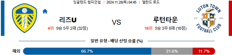[킹콩티비]11월 28일 리즈 vs 루턴 타운 챔피언쉽 해외축구분석 무료중계 스포츠분석