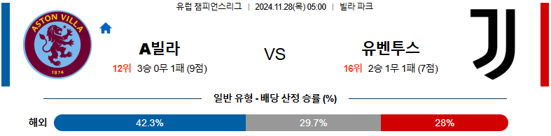 [킹콩티비]11월 28일 아스톤 빌라 vs 유벤투스 UEFA CL 해외축구분석 무료중계 스포츠분석