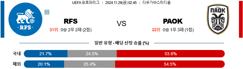 [킹콩티비]11월 29일 RFS vs PAOK UEFA 유로파리그 해외축구분석 무료중계 스포츠분석