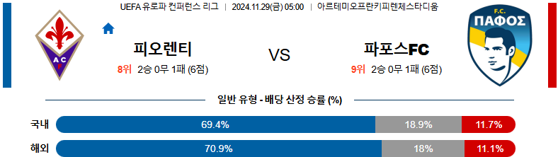 [킹콩티비]11월 29일 피오렌티나 vs 파포스 UEFA 컨퍼런스리그 해외축구분석 무료중계 스포츠분석