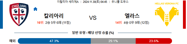 [킹콩티비]11월 30일 칼리아리 vs 엘라스 베로나 세리에 A 해외축구분석 무료중계 스포츠분석
