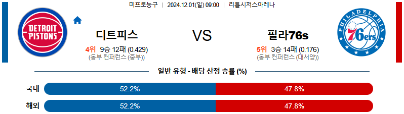 [킹콩티비]12월 01일 디트로이트 vs 필라델피아 76s NBA 해외축구분석 무료중계 스포츠분석