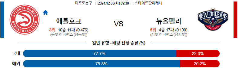 [킹콩티비]12월 03일 애틀란타 호크스 vs 뉴올리언스 펠리컨스 NBA 해외축구분석 무료중계 스포츠분석