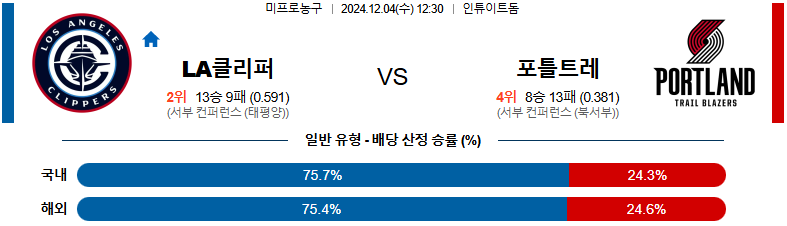 [킹콩티비]12월 04일 LA클리퍼스 vs 포틀랜드 트레일블레이저스 NBA 해외축구분석 무료중계 스포츠분석