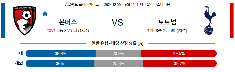 토트넘은 경기를 지배하려고 하겠지만, 최전방과 최후방에서의 부상 공백이 치명적이다. 본머스는 역습 전개에서 강점을 보이며 토트넘의 불안한 수비 라인을 공략할 가능성이 높다. 본머스 승리와 오버(3.5 기준)가 예상된다.