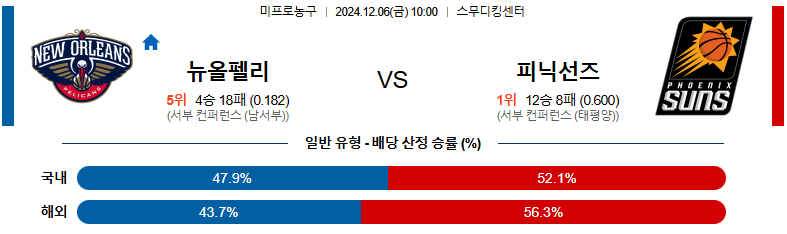 [킹콩티비]12월 06일 뉴올리언스 펠리컨스 vs 피닉스 선즈 NBA 미국프로농구분석 생중계 무료중계 스포츠분석