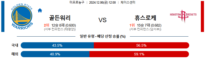 다음날 홈에서 미네소타를 만나는 일정을 위해서 힘을 분산해야 하는 골든스테이트가 된다. 휴스턴이 밀리지 않는 전력 이다. 또한, 휴스턴이 한 박자 빠른 패스 게임을 선보일 것이다.