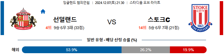 [킹콩티비]12월 07일 선덜랜드 vs 스토크 시티 잉글랜드 챔피언쉽 해외축구분석 생중계 무료중계 스포츠분석