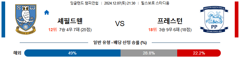 [킹콩티비]12월 07일 셰필드WED vs 프레스턴 잉글랜드 챔피언쉽 해외축구분석 생중계 무료중계 스포츠분석