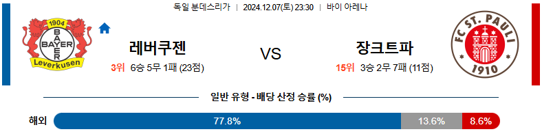 [킹콩티비]12월 07일 레버쿠젠 vs 장 파울리 분데스리가 해외축구분석 생중계 무료중계 스포츠분석