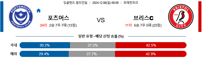 [킹콩티비]12월 08일 포츠머스 vs 브리스톨 시티 잉글랜드 챔피언쉽 해외축구분석 생중계 무료중계 스포츠분석