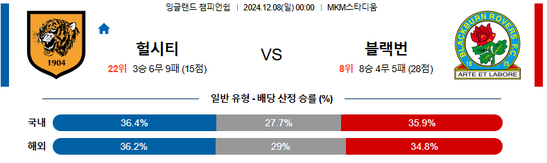 블랙번은 4-3-3 포메이션을 활용해 벡(LW)-돌란(RW)을 중심으로 속공 전개를 펼친다. 직전 리즈전(1-0 승)에서 상대에게 경기를 지배당했지만, 역습으로 승리를 거뒀다. 주전 2선 자원 캔트웰(MF)-바이만(MF)의 결장은 아쉽지만, 바스(DC)-히암(DC)의 수비 조직력과 트론스타드(DM)-베이커(DM)의 수비형 미드필더 조합은 견고하다. 헐 시티의 지공 전개에 흔들릴 가능성은 낮다.