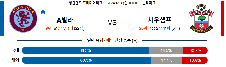 [킹콩티비]12월 08일 애스턴 빌라 vs 사우샘프턴 EPL 해외축구분석 생중계 무료중계 스포츠분석