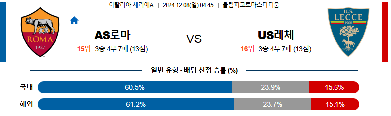 [킹콩티비]12월 08일 로마 vs 레체 세리에 A 해외축구분석 생중계 무료중계 스포츠분석
