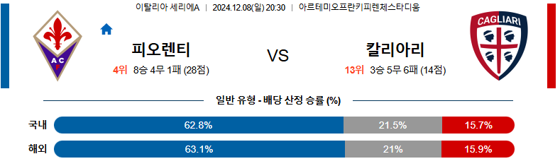 [킹콩티비]12월 08일 피오렌티나 vs 칼리아리 세리에 A 해외축구분석 생중계 무료중계 스포츠분석