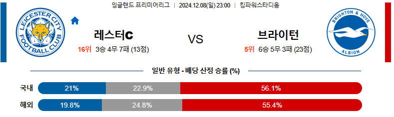 [킹콩티비]12월 08일 레스터 시티 vs 브라이튼 EPL 해외축구분석 생중계 무료중계 스포츠분석