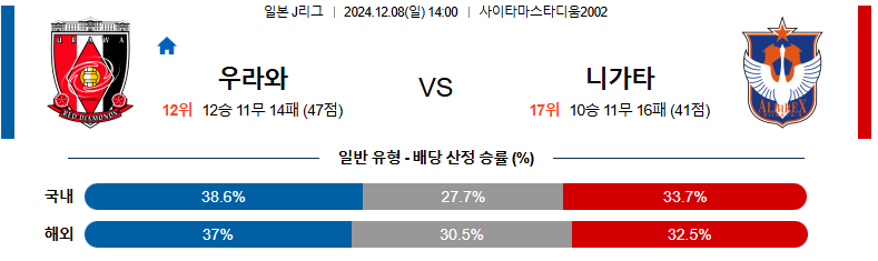우라와는 점유율을 바탕으로 경기를 지배하려 하겠지만, 니가타의 밀집 수비를 뚫기 어려울 전망이다. 반면, 니가타는 잔류 확정을 위해 수비에 집중하면서 속공으로 기회를 노릴 것이다. 양 팀 모두 공격력이 부진해 무승부와 언더(2.5 기준)가 예상되는 경기다.