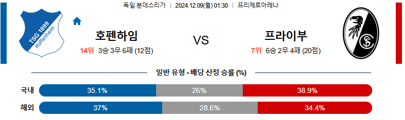 [킹콩티비]12월 09일 호펜하임 vs 프라이부르크 분데스리가 해외축구분석 생중계 무료중계 스포츠분석