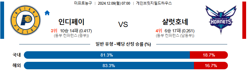 인디애나 페이서스 샬럿 호네츠 12월09일