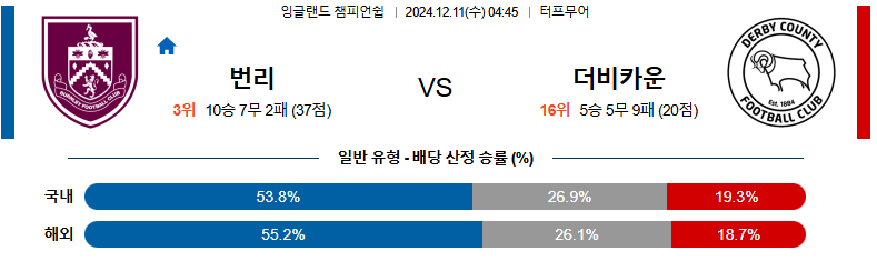[킹콩티비]12월 11일 번리 vs 더비 카운티 잉글랜드 챔피언쉽 해외축구분석 생중계 무료중계 스포츠분석