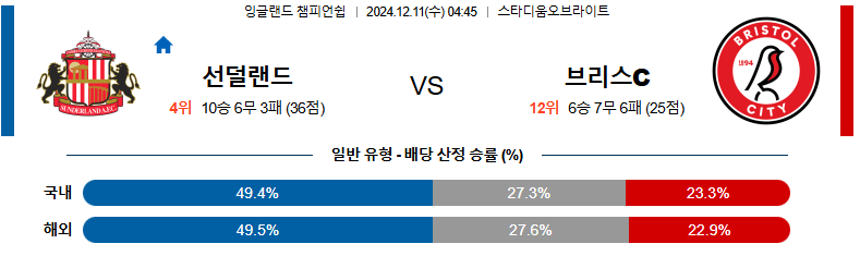 [킹콩티비]12월 11일 선덜랜드 vs 브리스톨 시티 잉글랜드 챔피언쉽 해외축구분석 생중계 무료중계 스포츠분석