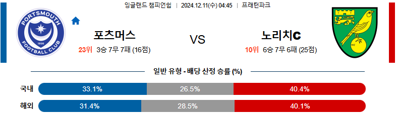 [킹콩티비]12월 11일 포츠머스 vs 노리치 시티 잉글랜드 챔피언쉽 해외축구분석 생중계 무료중계 스포츠분석