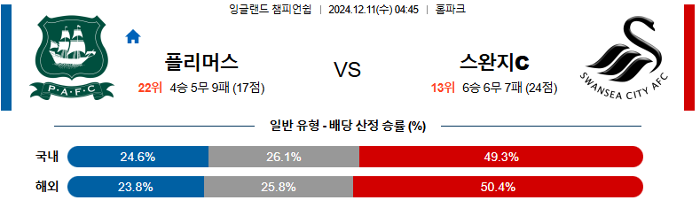 [킹콩티비]12월 11일 플리머스 vs 스완지 시티 잉글랜드 챔피언쉽 해외축구분석 생중계 무료중계 스포츠분석