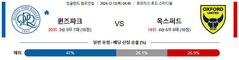 [킹콩티비]12월 12일 QPR vs 옥스퍼드 잉글랜드 챔피언쉽 해외축구분석 생중계 무료중계 스포츠분석
