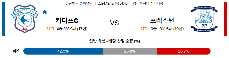 [킹콩티비]12월 12일 카디프 시티 vs 프레스턴 잉글랜드 챔피언쉽 해외축구분석 생중계 무료중계 스포츠분석