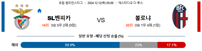 [킹콩티비]12월 12일 벤피카 vs 볼로냐 UEFA 챔피언스리그 해외축구분석 생중계 무료중계 스포츠분석