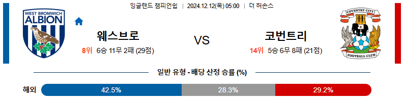 [킹콩티비]12월 12일 웨스트 브롬 vs 코번트리 시티 잉글랜드 챔피언쉽 해외축구분석 생중계 무료중계 스포츠분석