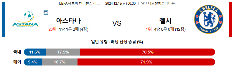 [킹콩티비]12월 13일 아스타나 vs 첼시 UEFA 컨퍼런스리그 해외축구분석 생중계 무료중계 스포츠분석