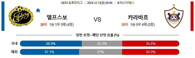 [킹콩티비]12월 13일 엘프스보리 vs 카라바흐 UEFA 유로파리그 해외축구분석 생중계 무료중계 스포츠분석