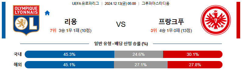 [킹콩티비]12월 13일 올랭피크 리옹 vs 프랑크푸르트 UEFA 유로파리그 해외축구분석 생중계 무료중계 스포츠분석