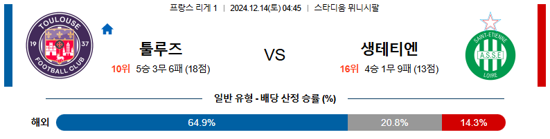 [킹콩티비]12월 14일 툴루즈 vs 생테티엔 리그앙 해외축구분석 생중계 무료중계 스포츠분석