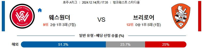 웨스턴 시드니는 역습과 전진 패스를 통해 브리즈번의 불안한 수비 라인을 공략하며 경기를 지배할 가능성이 높다. 브리즈번은 수비 조직력의 한계로 대량 실점을 피하기 어려울 것으로 보인다. 웨스턴 시드니의 승리와 오버(3.5)가 예상된다.