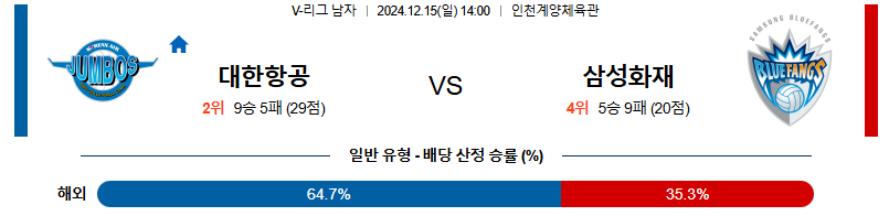 [킹콩티비] 12월 15일 대한항공 vs 삼성화재 V-리그 국내배구분석 생중계 무료중계 스포츠분석