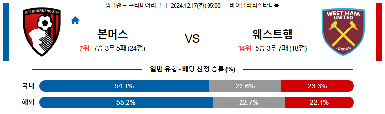 본머스 대 웨스트햄 EPL 12월17일 맞대결 생중계, 스포츠중계, 스포츠분석